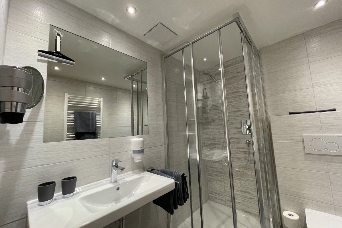 • Modernes Badezimmer mit Dusche, Kosmetikspiegel, Föhn, Seifenspender, WC